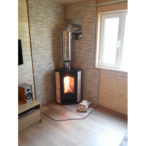 “Бавария пристенно-угловая с теплообменником” – это одна из моделей печей-каминов линейки “Бавария”, ориентированная на пристенно-угловой монтаж. Данный агрегат – оптимальное решение при выборе оригинального отопительного устройства для небольшого помещения. Максимальная длина поленьев, вмещающихся в топку печи, составляет 500 мм. Для подсоединения агрегата к системе отопления предусмотрен встроенный теплообменник, мощность которого 6 кВт. Данная модель печи-камина призвана радовать потребителя комфортным теплом и отличной панорамой горящих дров. Конструкция устройства предусматривает наличие чугунного колосника и уникальных керамических вставок, выполняющих функции декора на боковых панелях печи. Агрегат предельно прост в установке (достаточно лишь подсоединить его в дымоходу), оснащен эффективной системой очистки стеклянных вставок и может функционировать в режиме экономичного расходования дров. КПД модели – 78%. “Бавария пристенно-угловая с теплообменником” – это печь, которой присуща значительная нагревательная мощность (12+6 кВт). К тому же устройство может функционировать в режиме продолжительного горения (5 ч), являясь при этом главным источником тепла в жилище. Агрегат с легкостью обогреет окружающее пространства, не нуждаясь в большом количестве дров. Топка печи выполнена из листовой стали, толщина которой 6 мм, футерована шамотом и оборудована колосником из чугуна. Контур изготовлен из стали толщиной 3 мм. Будучи тщательно рассчитанным, конвективный контур безупречен в теплопередаче.